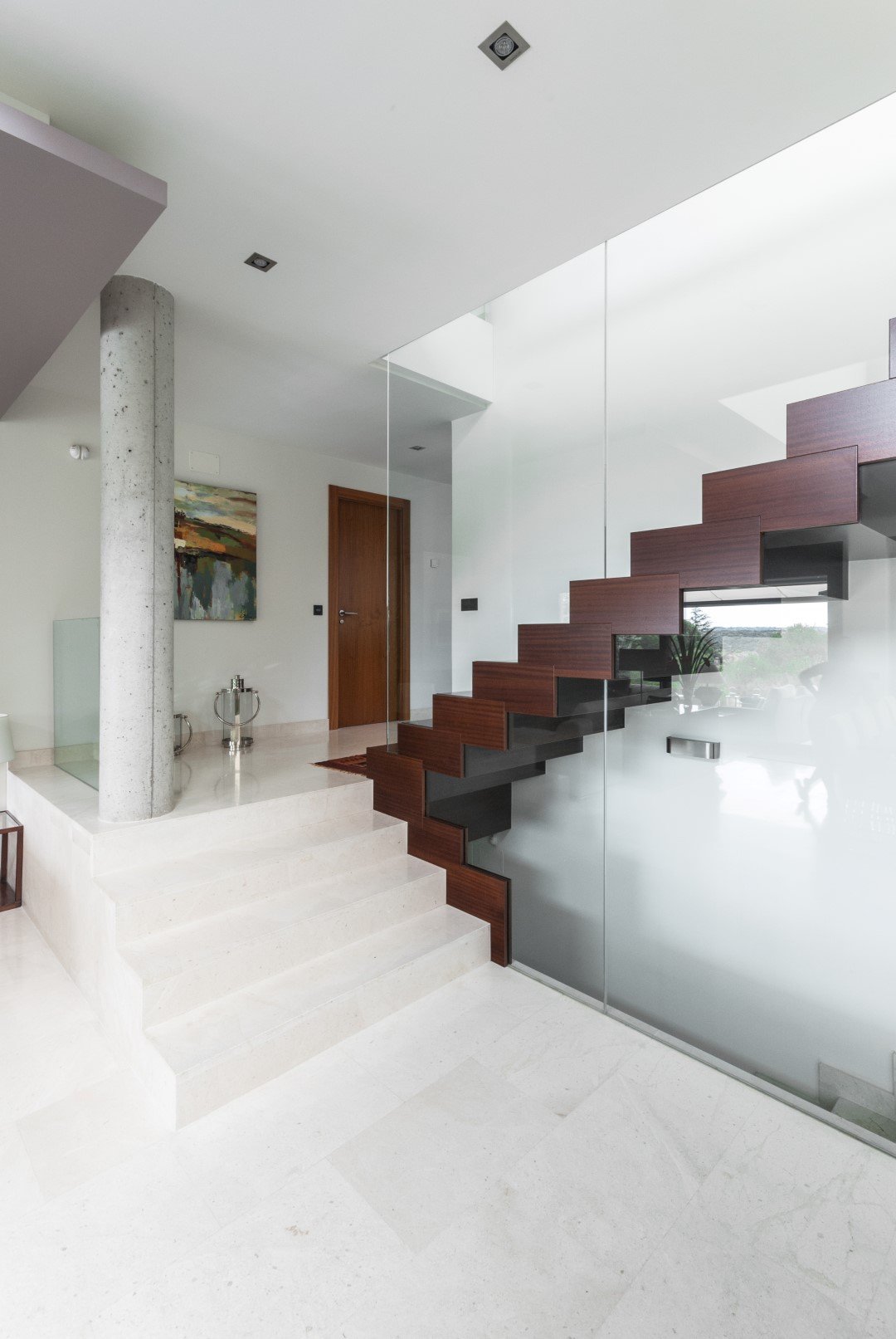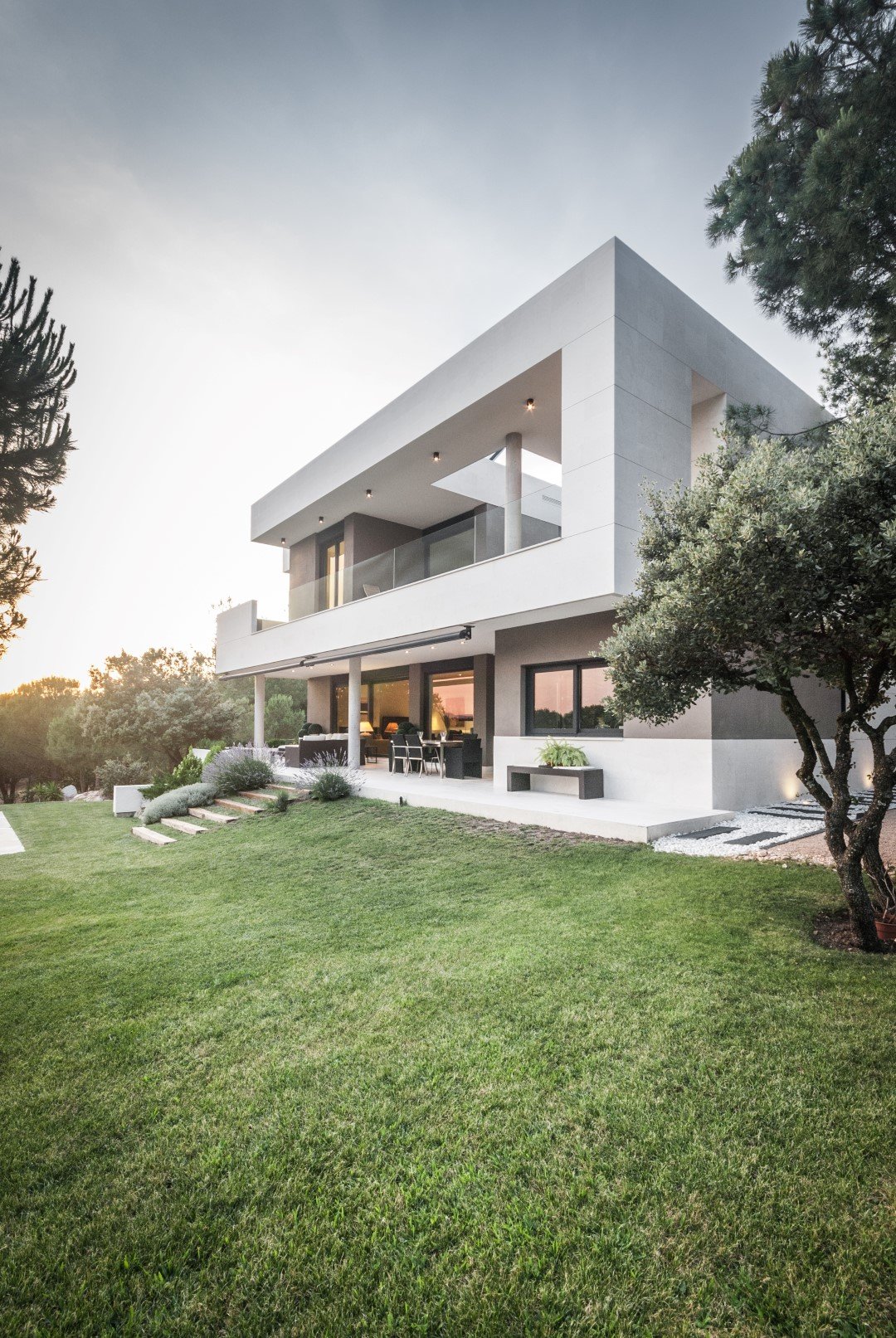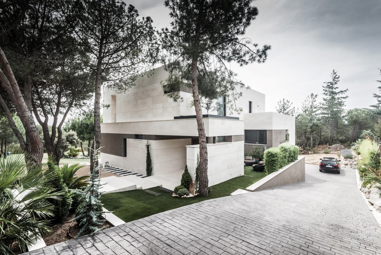 El diseño de la vivienda está marcado por una geometría rotunda que aporta personalidad a la casa, así como por una combinación de materiales, entre los que destacan la piedra caliza y el revoco.