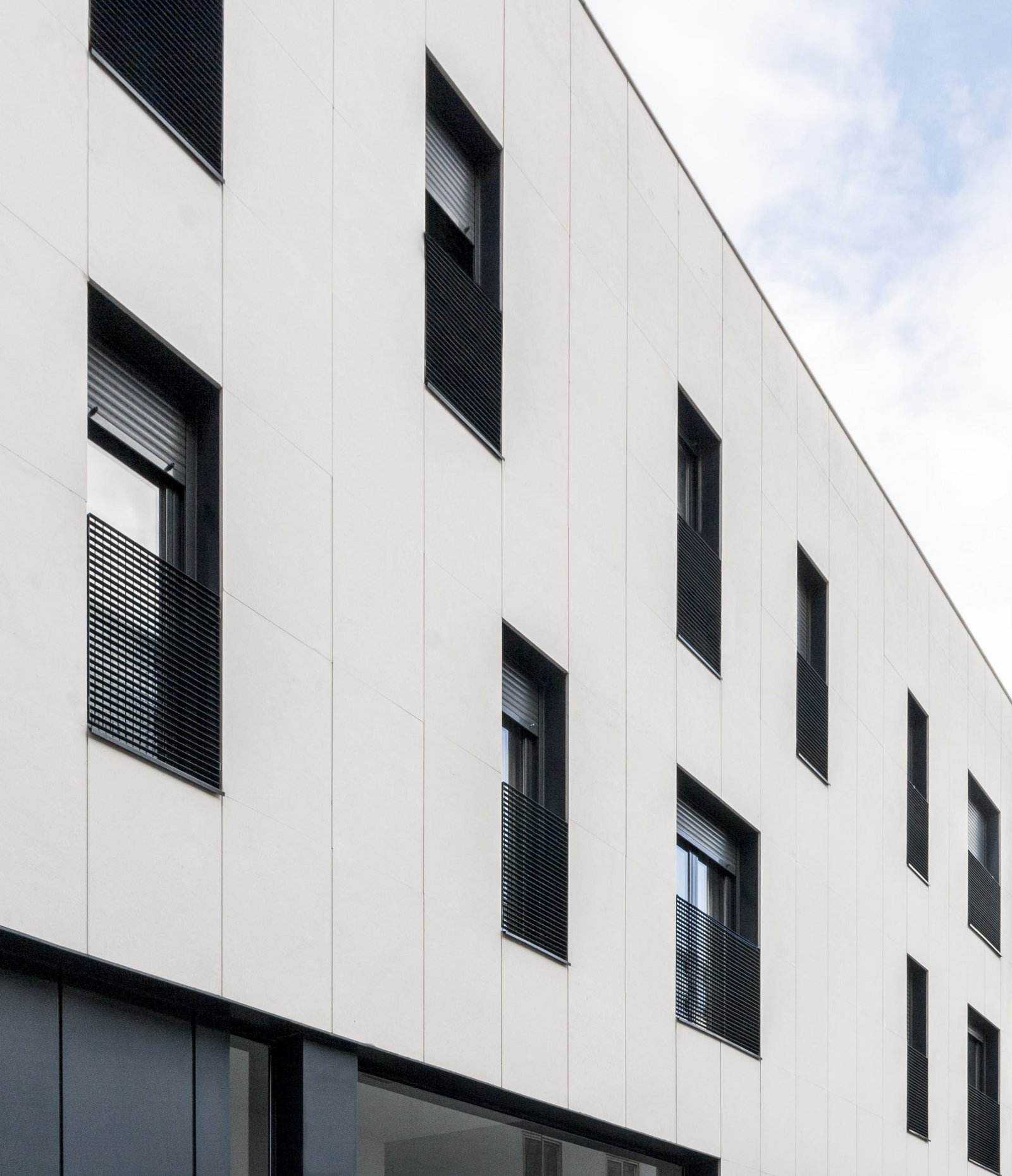 Los huecos de color oscuro horadados sobre la fachada de piedra blanca intensifican el concepto de «plano de fachada» como un elemento arquitectónico singular. El juego compositivo de los huecos, falsamente aleatorio, rompe la rigidez formal aportando dinamismo y modernidad.